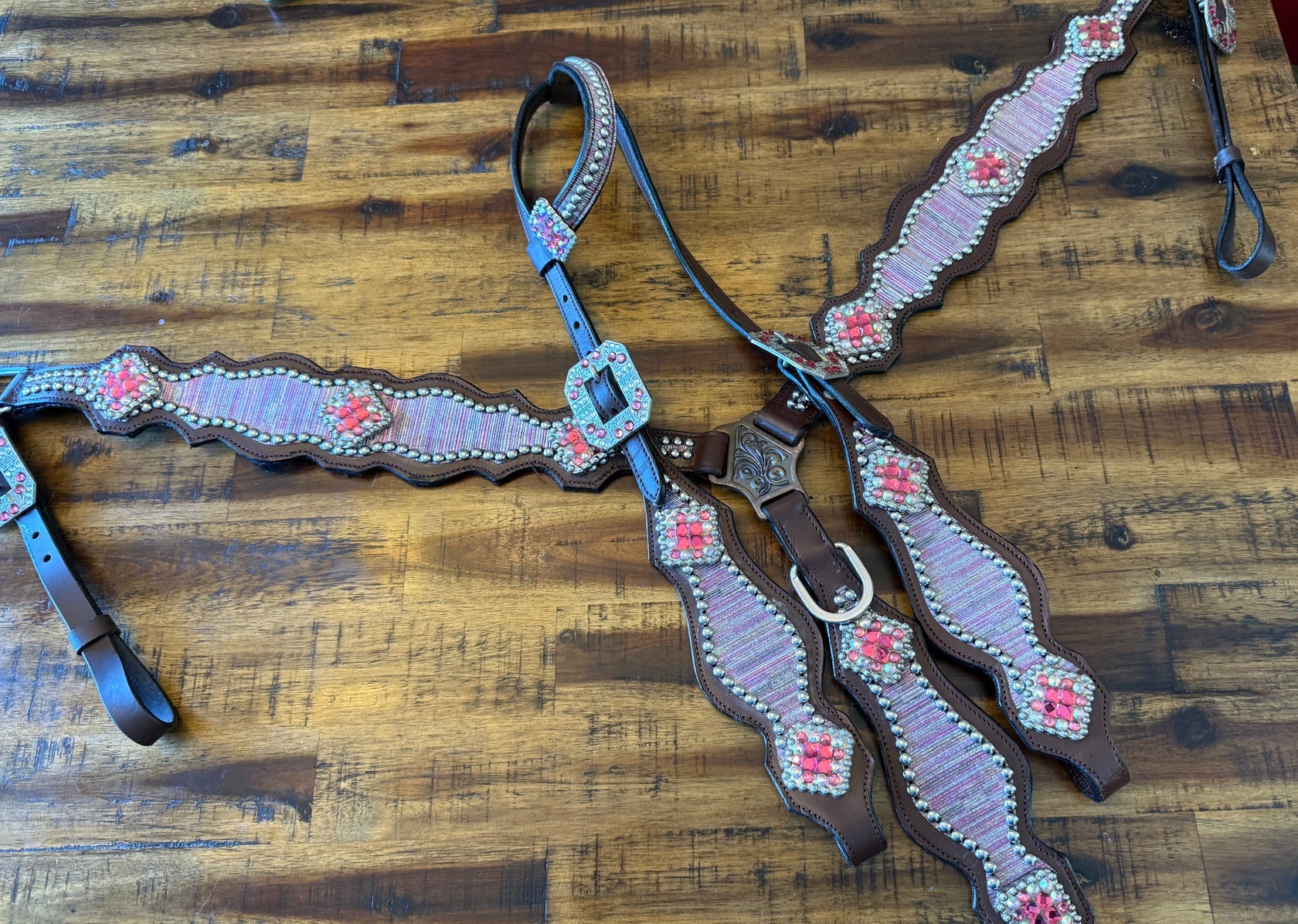 This collection features rich brown leather accented with a sparkle pink/silver inlay, creating a playful yet sophisticated contrast. Adorned with sage, pink, and clear iridescent gems that add subtle sparkle, it combines exceptional craftsmanship with a bold design. Experience the unique allure of this meticulously crafted set and unleash your inner wild cowgirl.